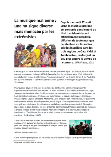 A Level French La Musique Au Mali Aqa Unit 6 La Musique