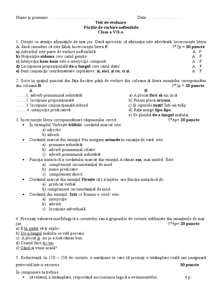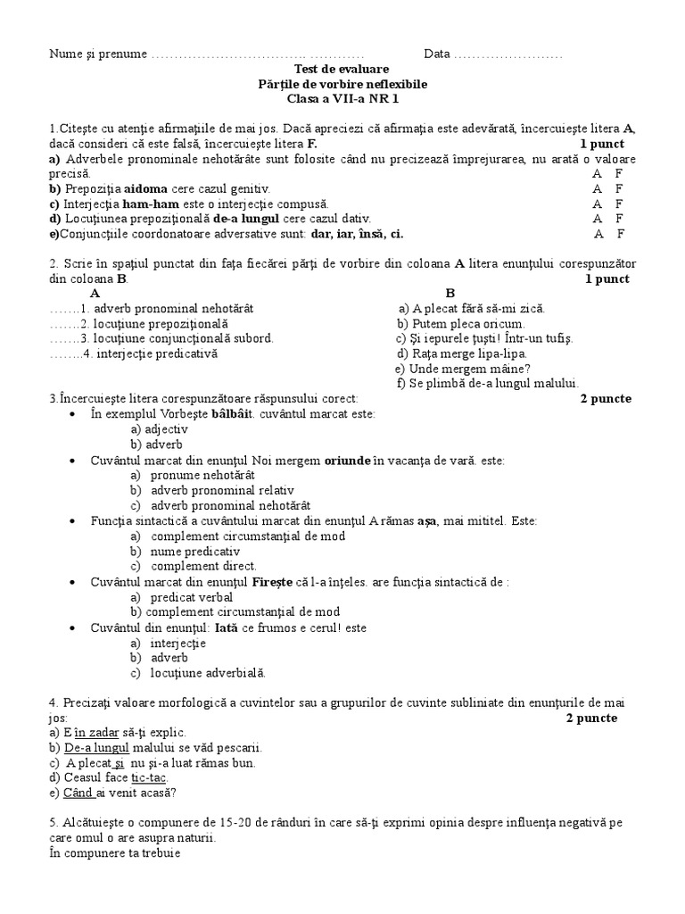 Test părți de vorbire neflexibile clasa a 7a. Părțile de vorbire sunt cuvinte sau locuțiuni care se grupează în funcție de sensul lor lexical fundamental și după caracteristicile morfologice și sintactice. Substantive defective de singular. Parti de vorbire neflexibile test grila 1. Vizualizaţi 0 review uri 49 descărcări adăugat la.